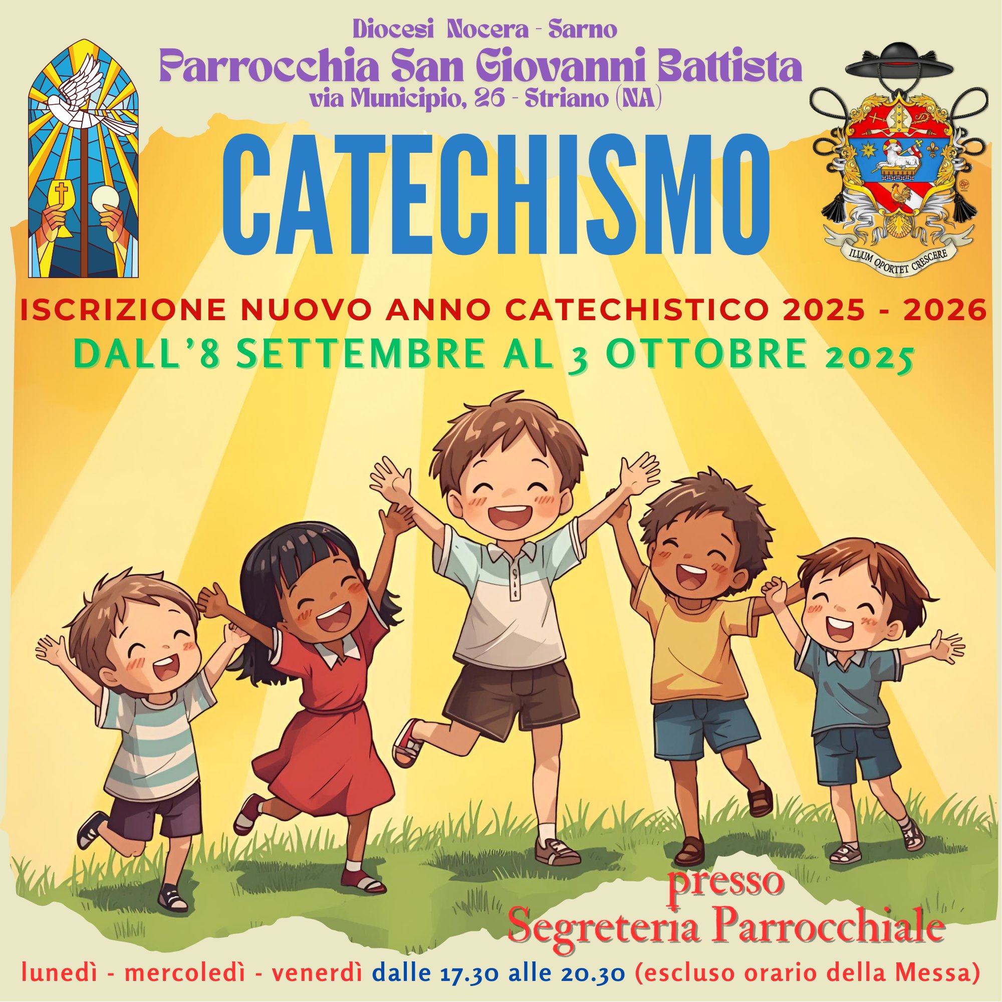 Dall’8 settembre al 3 ottobre è possibile iscriversi al Catechismo per il nuovo anno catechistico 2025-2026. Bisogna recarsi presso la Segreteria Parrocchiale, il lunedì, mercoledì e il venerdì dalle 17.30 alle 20.30 (escluso orario della Messa).